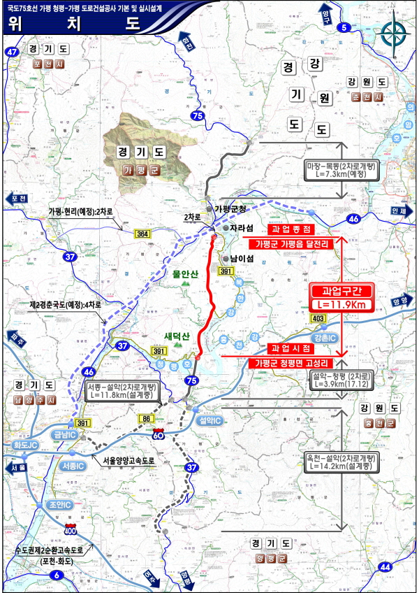 국도75호선 가평~청평 도로신설공사는 청평면 고성리 가평대교에서 가평읍 달전리 상수소사업소까지 11.9㎞ 구간의 도로와 선형을 정비하는 사업으로, 이번 사업을 통해 선형이 불량한 지역에 터널 2개와 교량 7개가 신설된다.
