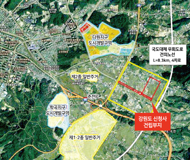 속보=강원도가 신청사 건립 부지 세부위치를 춘천시 동내면 고은리 373번지 일원(본지 2월 14일자 4면)으로 최종 확정했다.수도권·강원 남부권·강원 북부권 간 접근 편리성 확보를 위해 국도 5호