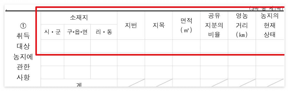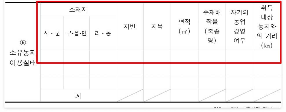토지 소유자가 다른 농지를 소유했다면 기재해 주시면됩니다. 소재지와 지번, 지목, 면적 주재배작물의 종류와 본인이 직접 농영경영을 하는지 여부와 취득 대상 농지와의 거리를 기재해 주시면 됩니다.
