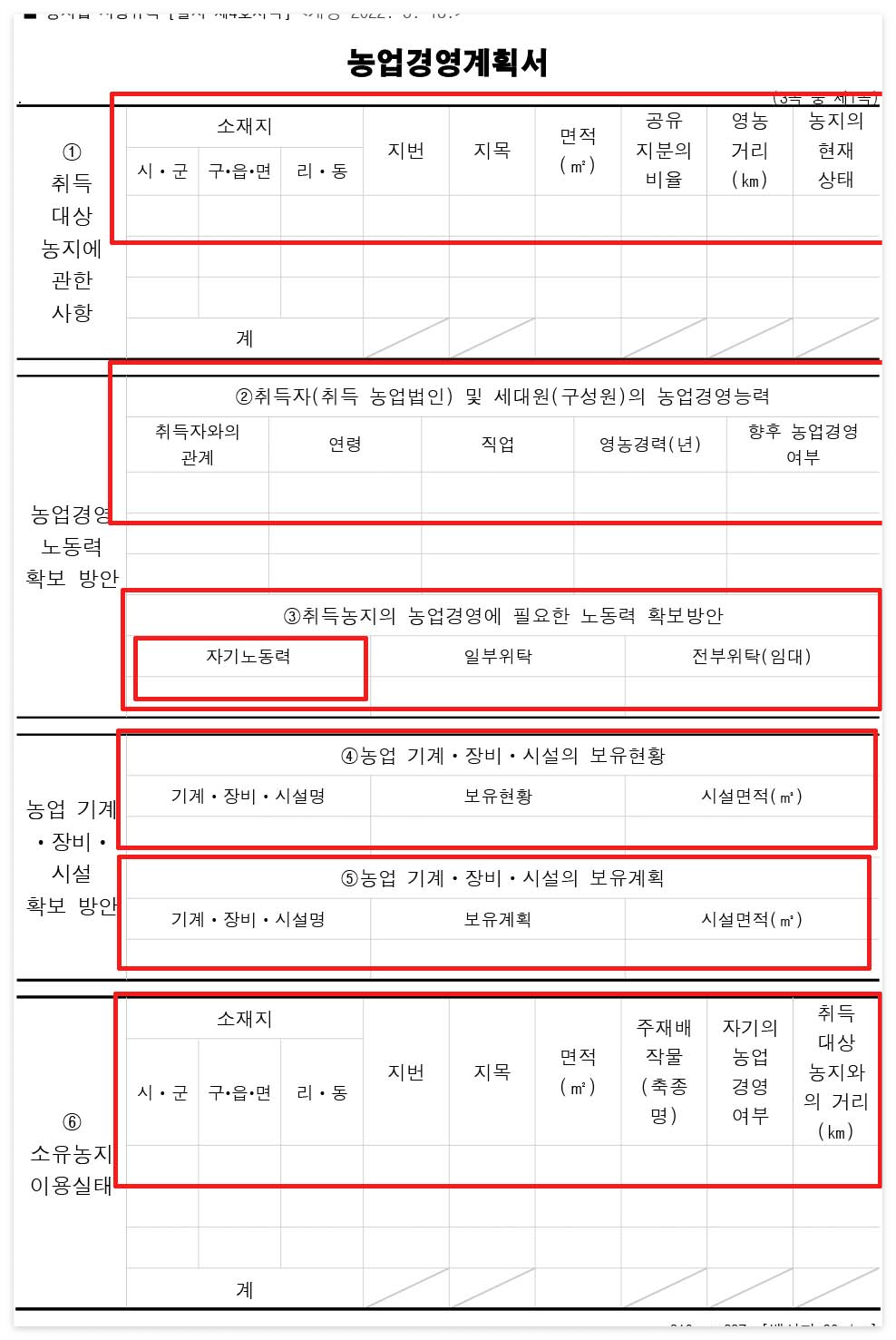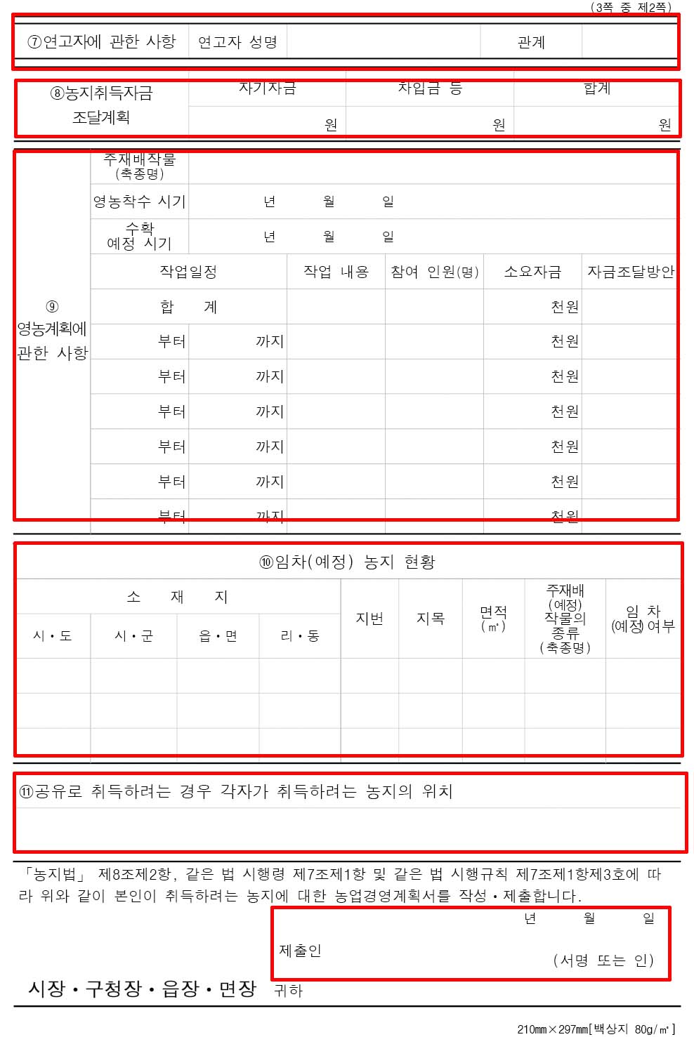 농업경영계획서란 농업을 경영하기 위한 농지에 대한 정보와 앞으로의 계획을 작성하는 문서라고 보시면 됩니다. 농업경영계획서는 소재지, 면적,지분 등의 취득하는 농지에 대한 정보와 농업경영을 위한 노동력확보, 농업장비와 시설에 대한 정보, 소유자의 소유농지 실태, 현 농지에 연고자의 정보, 농지취득하기 위한 자금조달계획과 영농계획에 대해 작성하시면 됩니다.