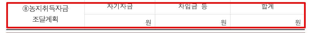 해당 농지를 취득할 자금 계획을 기재해주세요. 자기 자금과 차입금(대출금), 총합계 금액을 기재합니다.
