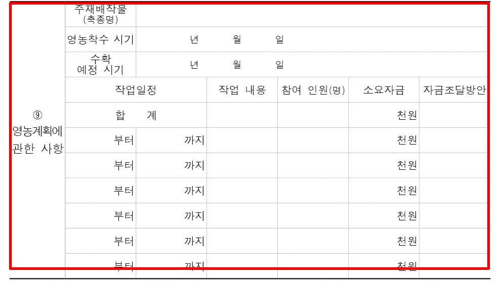 해당 농지에 대한 영농 계획을 기재해주세요. 주재배작물은 무엇인지, 영농착수시기는 언제인지, 수확시기는 언제인지, 작업일정은 6개월 단위로 3년치를 기재합니다. 어렵게 생각지 마시고, 대략적인 농사를 지을 계획을 기재하시면 됩니다.