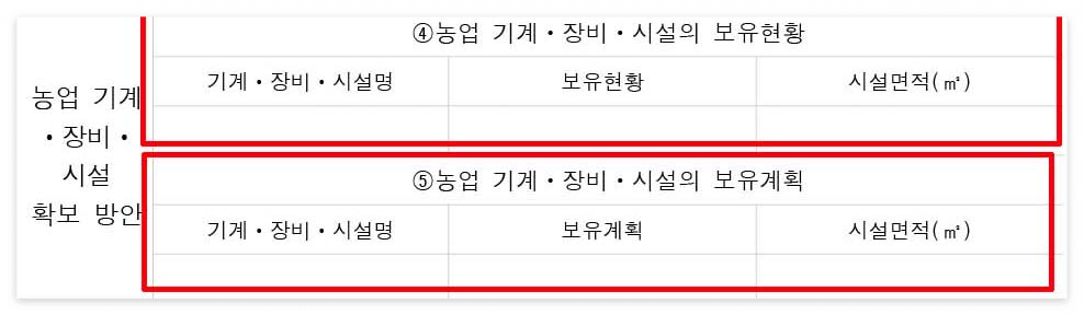 농업용 기계와 장비 시설을 보유할 계획이라면 기재해 주세요. 큰 기계가 아니라도 호미, 낫과 같은 작은 장비라도 적어주시면 좋습니다. 구매예정이라면 00월 구매예정으로 기재해 주세요.