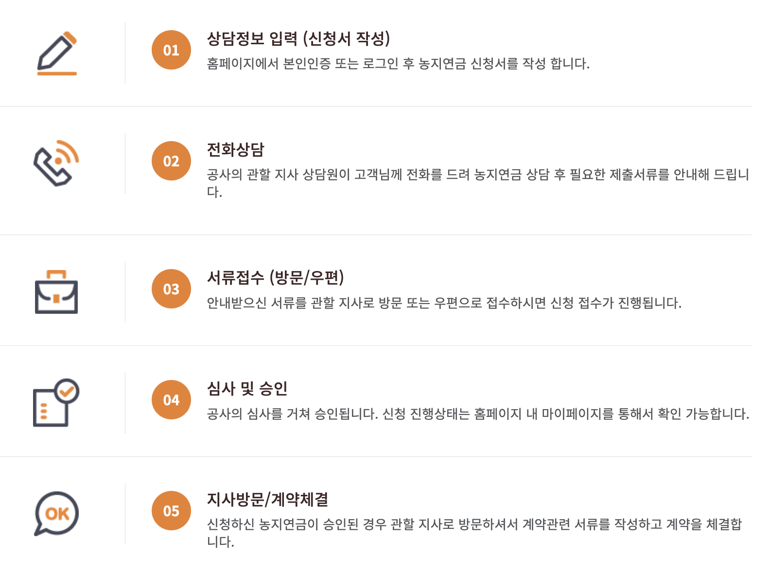 - 농지은행,농지연금 포털 에서 인터넷 접수신청을 하면 공사 직원이 연락을 드려 농지연금 가입절차를 진행합니다.