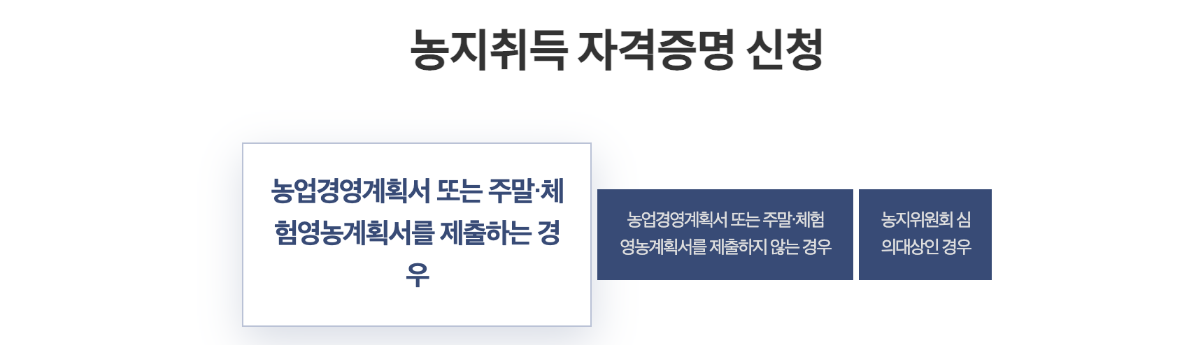 | 농업경영계획서 제출 | - 농지를 농업경영 목적으로 취득하는 경우 - 취득하려는 해당 필지를 포함하여 세대당 1,000m2 이상의 신청서를 제출할 시 |