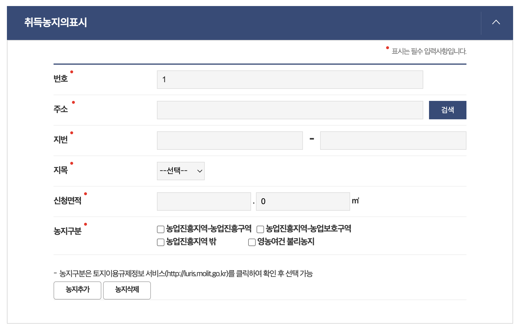 토지이음 (http://www.eum.go.kr/) 에서 확인 후 취득농지에 대한 정보를 입력합니다.