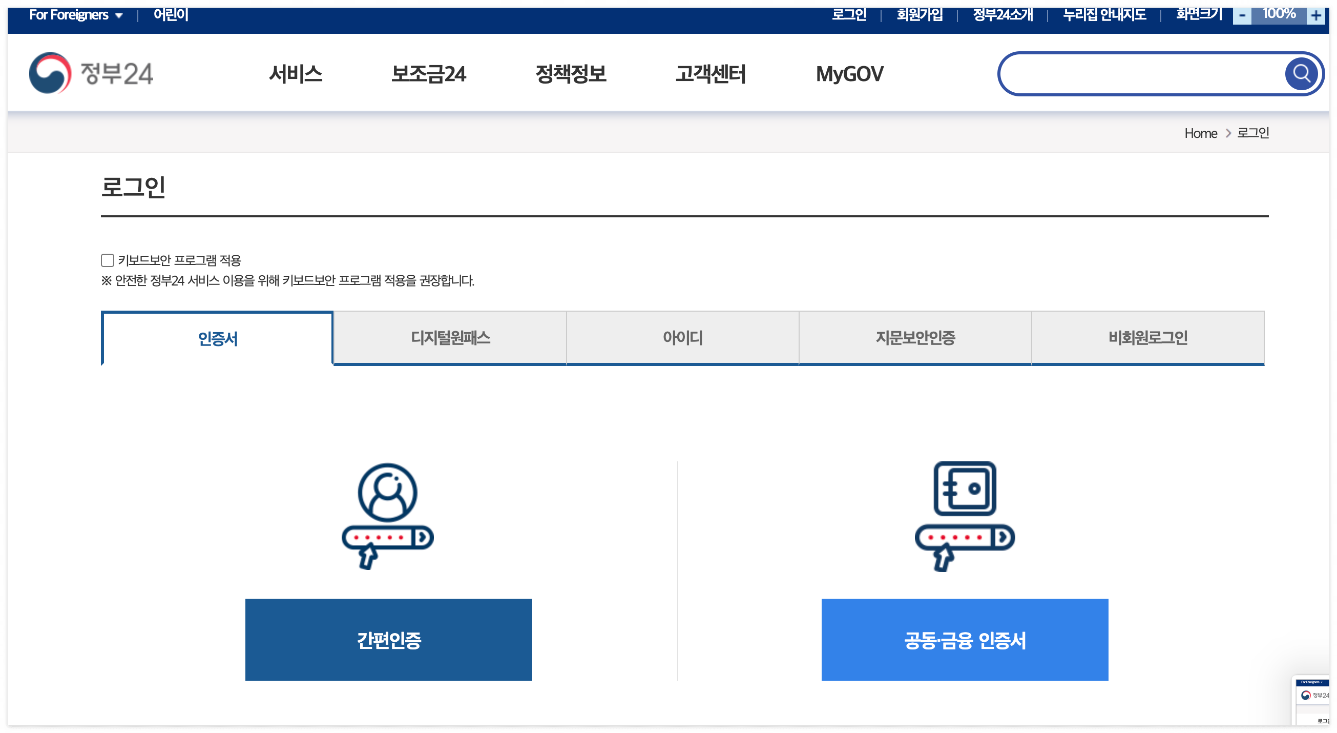2. 간편인증이나 공동인정서 또는 금융인증서로 로그인