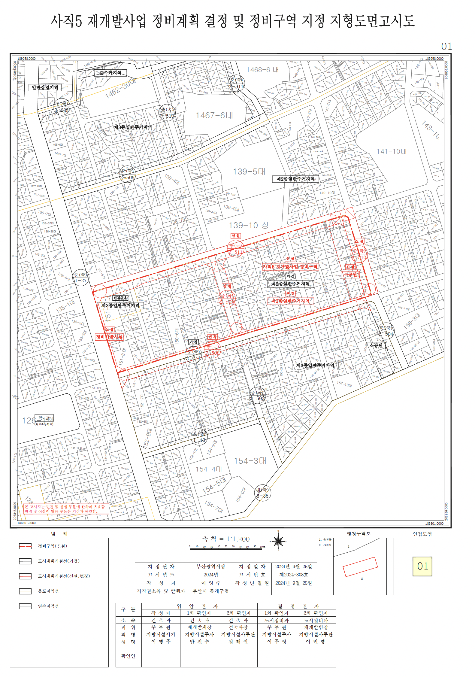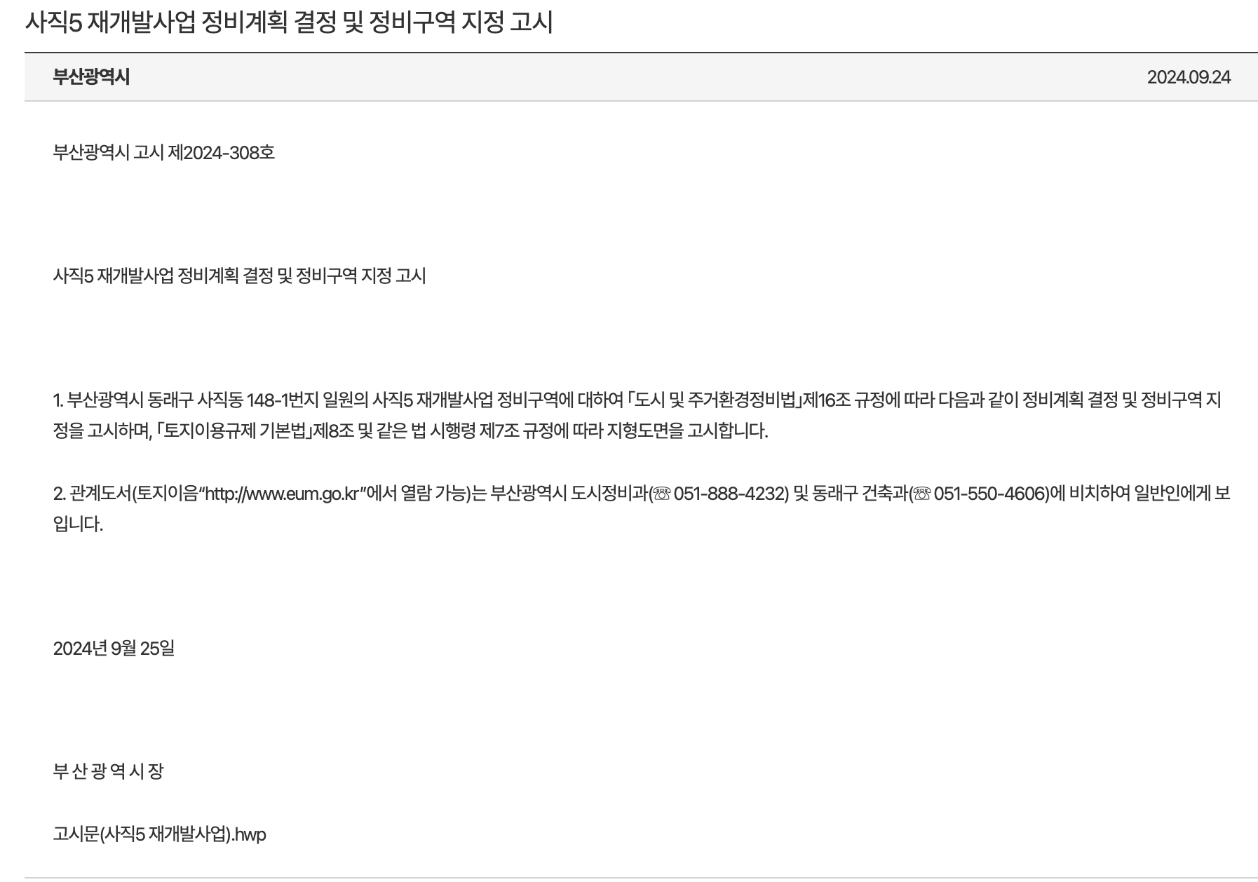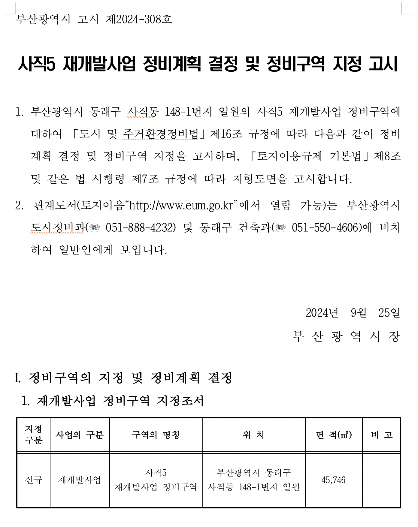 부산광역시 2024.09.24 부산광역시 고시 제2024-308호 사직5 재개발사업 정비계획 결정 및 정비구역 지정 고시 1. 부산광역시 동래구 사직동 148-1번지 일원의 사직5 재개발사업 정비구역에 대하여 「
