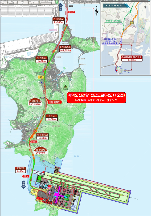 가덕도신공항 접근도로 노선도(제공:국토교통부)[대한경제=이재현 기자]합계 총사업비 1조7000억원 규모의 가덕도신공항 접근철도와 도로 건설사업이 공사 발주에 시동을 걸었다. 국토교통부가