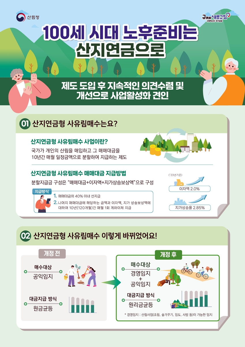 산림청 "경영 어려운 개인산지를 국유림 전환해 효율적 관리할 것" 개인이 소유한 산을 매각하고 대금을 10년간 연금형으로 받는 '산지연금형 사유림 매수사업'이 산주로부터 좋은 반응을 얻고