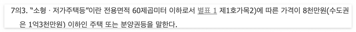 기존에는 [주택 공급에 관한 규칙] 제2조 제7의 3호에 의해 "소형• 저가주택" 이란 전용면적 60m2 이하로 주택공시가격 수도권 1억3천만원, 지방 8천만 원 이하를 말합니다.