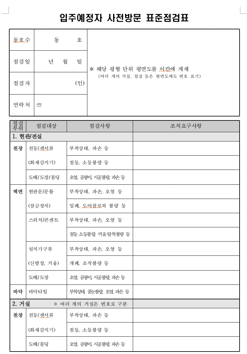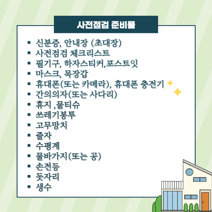 - 미리 체크리스트를 준비하셔서 차근차근 점검하다 보면 시간도 절약하고 꼼꼼하게 하자 부분을 체크