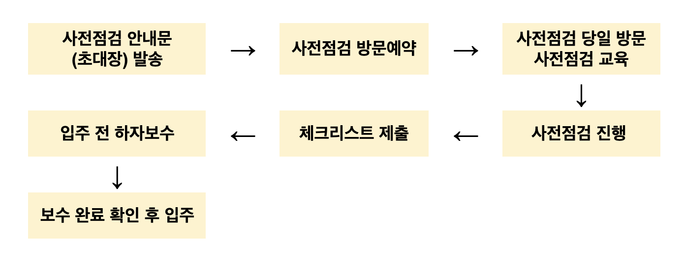 시공사에서 입주민들에게 안내장을 발송하고, 방문예약을 통해 사전점검 날짜와 시간을 신청합니다. 이후 사전점검 당일날 입주민센터에 방문해 사전점검 교육을 받고, 사전점검을 통해 하자 등을 체크합니다. 체크리스트를 제출하면 입주 전에 하자보수가 이뤄집니다. 보수가 완료되면 확인 후에 입주합니다.
