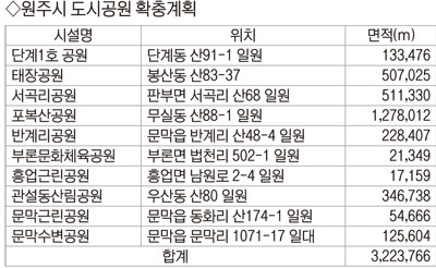 2022년 기준으로 원주시민 1인당 도시공원 면적은 8.2㎡이다. 춘천시 21.3㎡, 강릉시 13.6㎡는 물론 강원특별자치도 평균 1인당 도시공원 면적인 17㎡보다 적은 상황이다. 전국 평균인 12.4㎡보다도 적