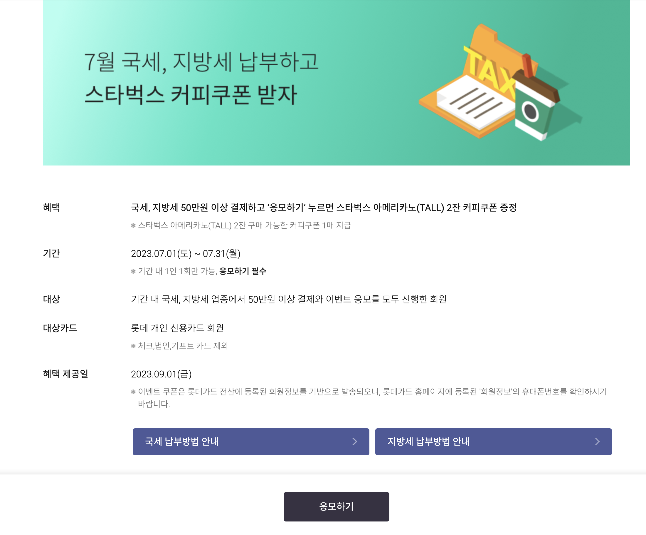 롯데카드는 지방세 50만원 이상 결제 후 이벤트 페이지에 응모하기를 하면, 스타벅스커피 쿠폰 2장을 제공합니다.