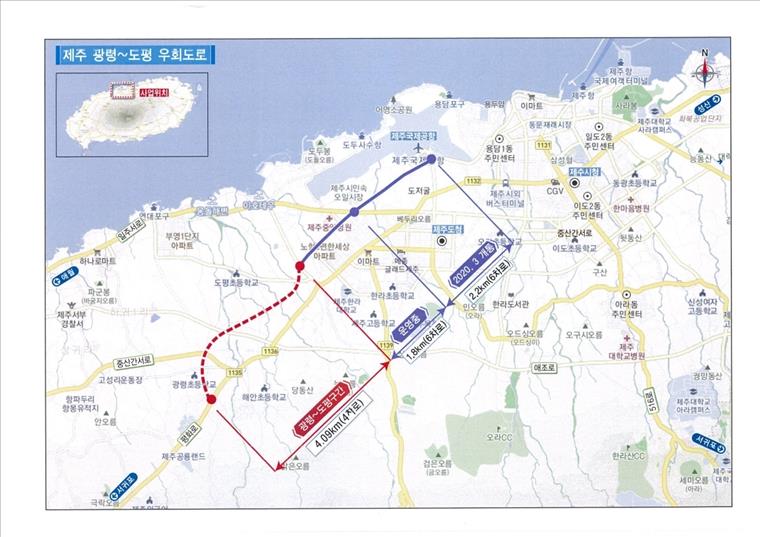 공항이용객 통행시간 단축, 제주 서부권 도심지 교통혼잡 해소 기대 제주특별자치도는 평화로 광령에서 노형동(도평동) 우회도로 건설사업이 기획재정부 예비타당성조사가 통과