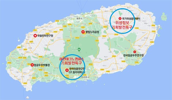 첫 제주 우주산업 : 옛 탐라대학교 부지에 조성되는 '하원테크노캠퍼스'와 국가위성운영센터가 위치한 '구좌위성정보단지' 등 두 축으로 추진
