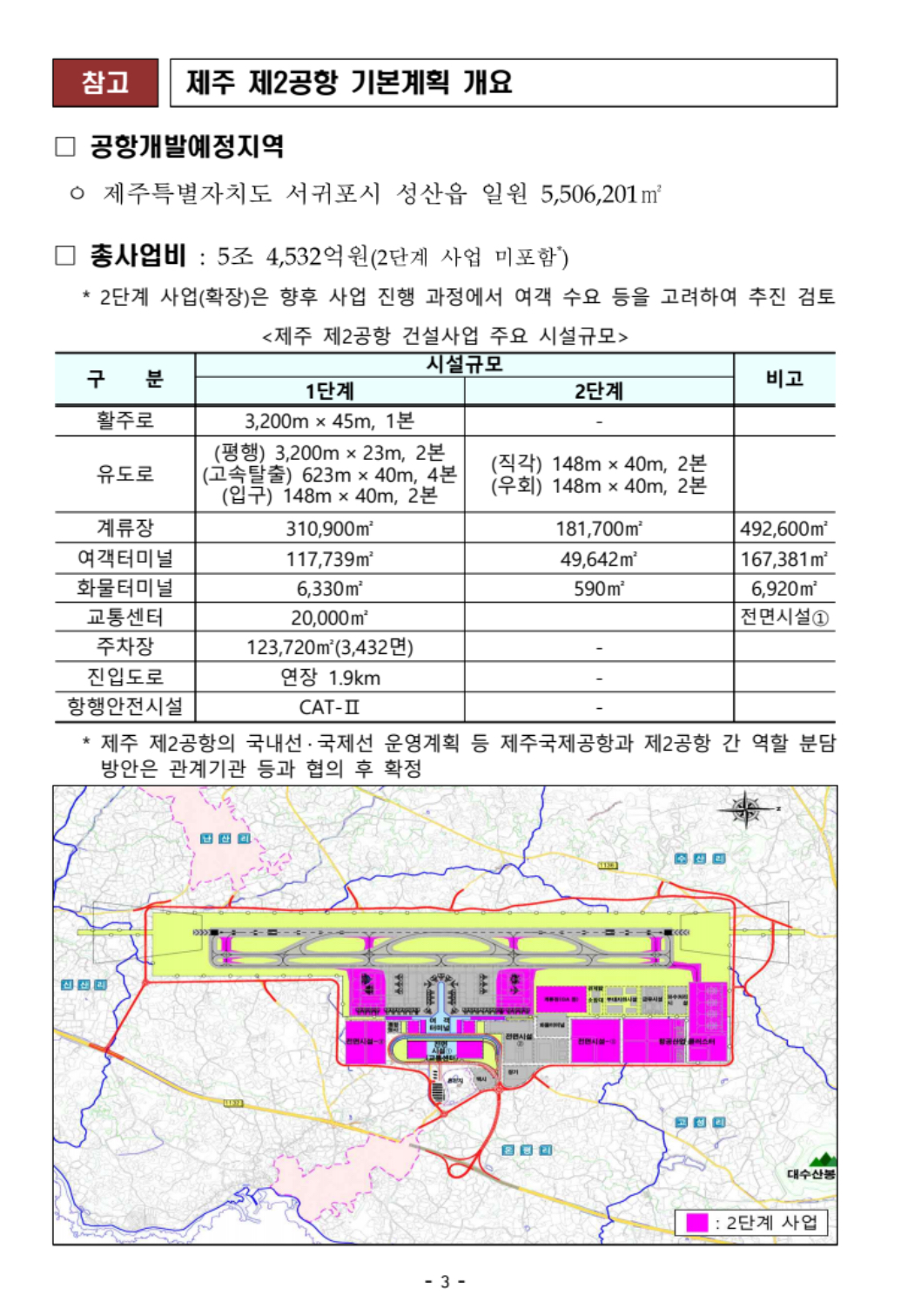 - 제주 제2공항은 서귀포시 성산읍 일대에 551만㎡ 면적으로 조성