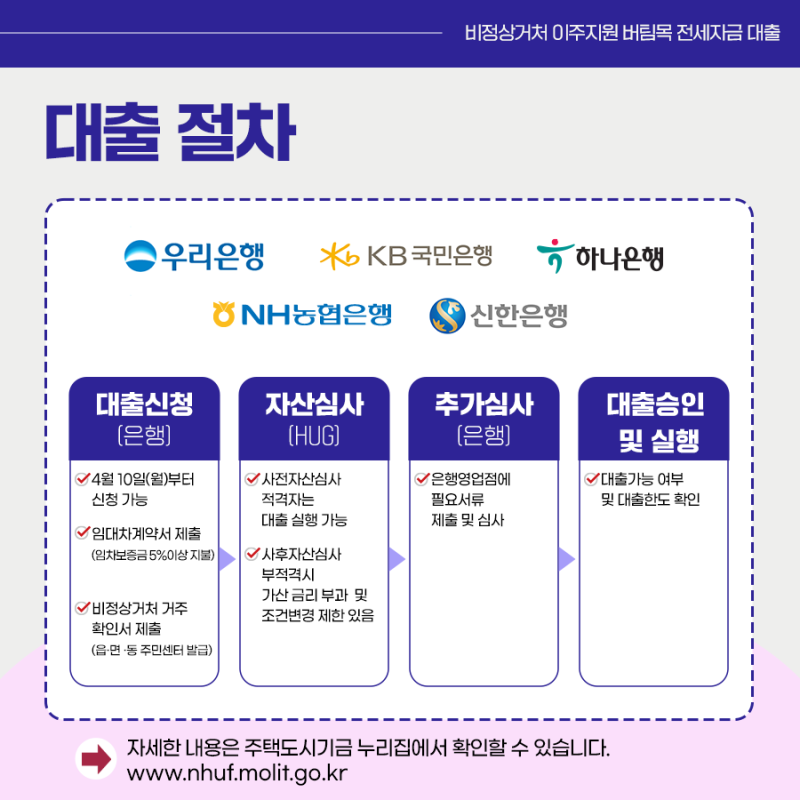 대출을 희망하는 분들은 비정상 거처 거주확인서를 거주 소재지의 주민센터에서 발급받아 계약하려고 하는 주택의 임대차계약서 등을 함께 지참하여 취급 은행에 방문 후 접수 할 수 있습니다. 은행에서는 접수 받은 서류를 통해 심사를 거쳐 대출을 지원하게 되며, 올해 5천호에 대해 접수합니다.