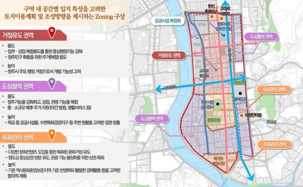 - 권역별 건축물의 용도를 ▲도심상권 회복 ▲가로활성화 ▲부족시설 확충에 관련된 용도를 권장용도로 ▲주거환경에 저해되는 용도를 불허용도로 계획해 생활중심 기능이 활성화