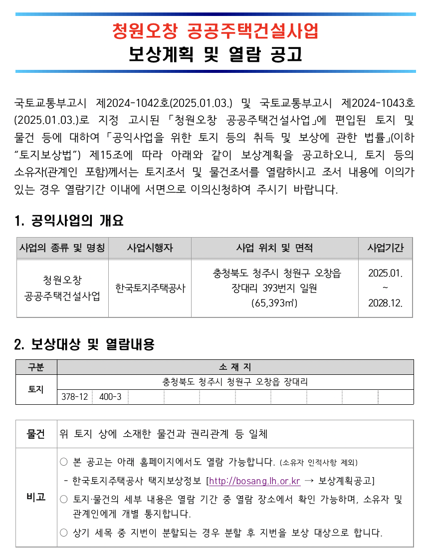 내용 청주시 청원구 오창읍 장대리 393번지 일원 청원오창 공공주택건설사업에 편입된 토지 및 물건 등에 대하여 「공익사업을 위한 토지 등의 취득 및 보상에 관한 법률」제15