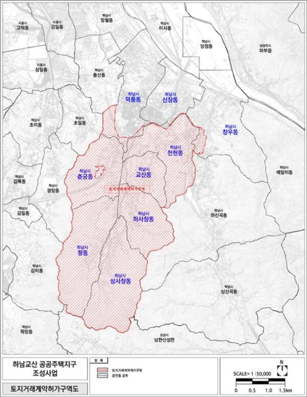 대상 지역은 국토부가 25일까지 지정한 하남교산 공공주택지구 및 그 인근지역으로 덕풍동, 신장동, 창우동, 천현동, 춘궁동 일부, 교산동, 항동, 상사창동, 하사창동 전체 지역이다.