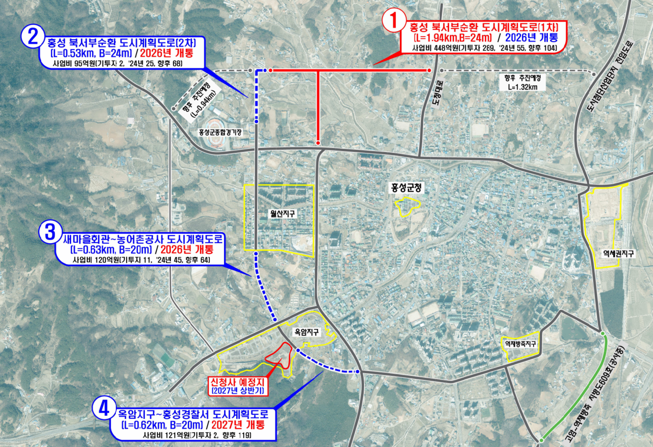 홍성군이 신청사 이전과 내포신도시 활성화에 따른 교통체계 확충을 위해 대규모 내부순환도로망 구축에 돌입했다. 홍성읍 북서부권 간선도로 조기 개통을 통해 내포신도시와 원도심을 잇는